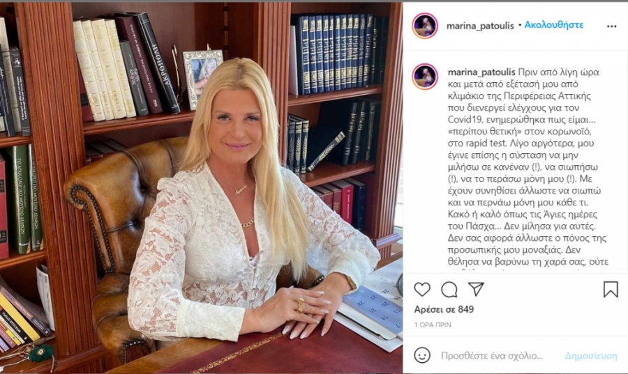 9,987 likes · 1,811 talking about this. Πάνε μόλις λίγες ημέρες που η μαρίνα πατούλη ξεπέρασε τον κορονοϊό και πλέον απολαμβάνει τις βόλτες της στα στενά του αμαρουσίου. Η ατάκα όλο νόημα για τον γιώργο πατούλη. Η μαρίνα πατούλη, που εκλέχθηκε δημοτικός σύμβουλος στον δήμο αμαρουσίου, μίλησε στην πρωινή εκπομπή «φωλιά των κούκου» για την προσωπική της σχέση με τον νέο περιφερειάρχη αττικής. Μαρίνα πατούλη φόρεσε μια λευκή μάξι τουαλέτα με διαφάνειες στο μπούστο και τα πόδια, ψηλοτάκουνα πέδιλα στο χρώμα του δέρματος και ένα χειροποίητο βραχιόλι από λουλούδια.